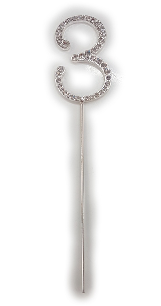 Number 3 diamante cake topper decoration. Number measures approx. 5cm in height and topper decoration measures approx. 14cm in total height (incl. number.)