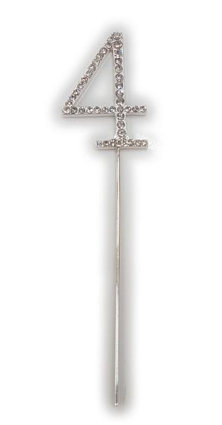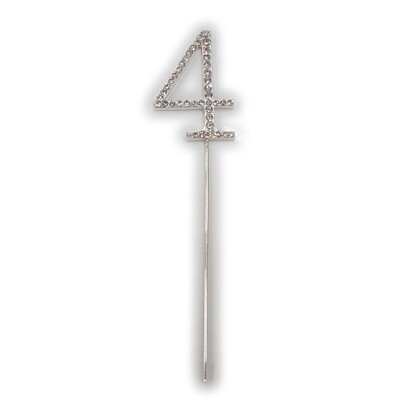 Number 4 diamante cake topper decoration. Number measures approx. 5cm in height and topper decoration measures approx. 14cm in total height (incl. number.)