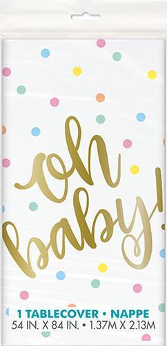 Baby shower themed plastic tablecover, measures approx. 137cm x 213cm. Colours/design may vary from image.
