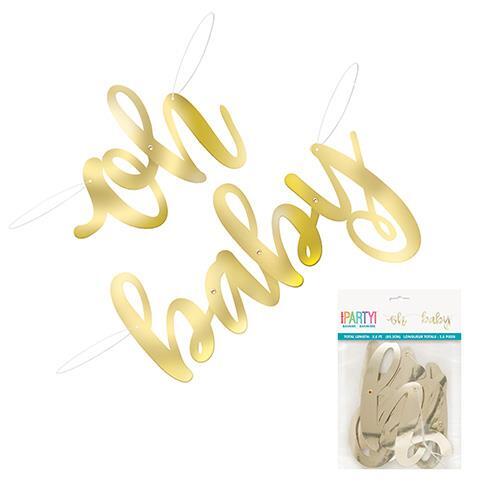 Baby shower themed shiny gold 2-piece 'oh baby' script banner, measures approx. 85.3cm in total length (the two pieces together.) Colours/design may vary from image. Cardboard.