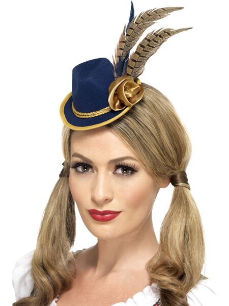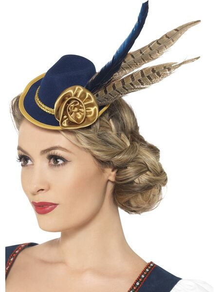 Complete your Oktoberfest outfit with this cute mini hat on clips. Hat is Navy Blue in colour with Gold trimmings and a Gold material rose and feathers attached for some extra flair. 2x plastic clips attached to hat so it's easily clipped into your hairstyle. Hat measures 16cm X 15.5cm and approx 8cm in height. Feathers measure approximately 10-13cm in length but will vary from hat to hat.