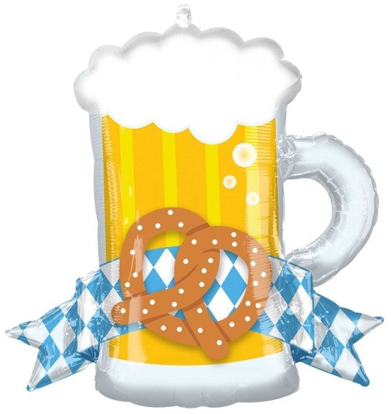 This fabulous shaped foil balloon shows a frothy beer mug with handle and includes a blue & white Bavarian banner & pretzel decal.