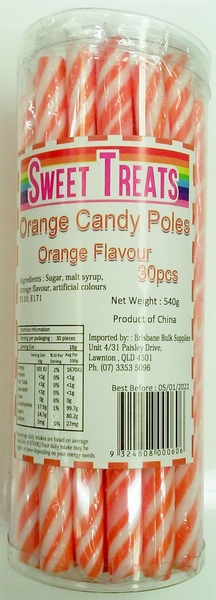 These delicious orange flavour candy poles will be a favourite amongst guests at any occasion! With 30 x 18g poles in a pack, they're easily coordinated with the rest of our confectionery and party supplies for your complete party planning needs! Poles measure approx. between 16cm-18cm in length. Poles are individually wrapped.