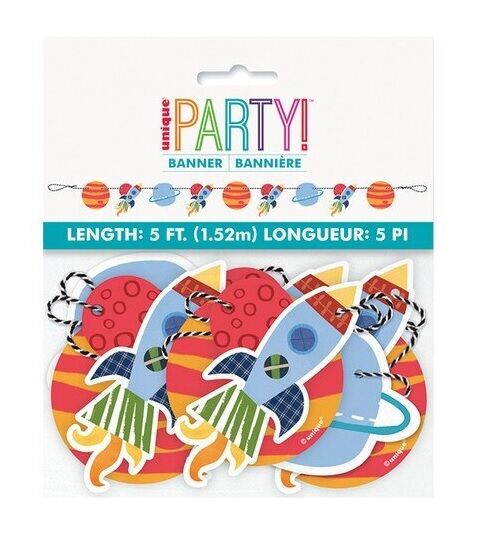 Perfect for birthdays, parties & outer space themes, this banner features alternating planet & rocket cardboard cutouts attached to white & black twine.