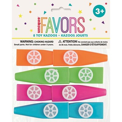Make some noise with these Kazoos. Perfect for party bag or pinata fillers. Assorted colours include but not limited to Orange, Green, Blue and Pink. Measuring 7.5cm in length and 2cm wide. 8 Kazoos in each pack