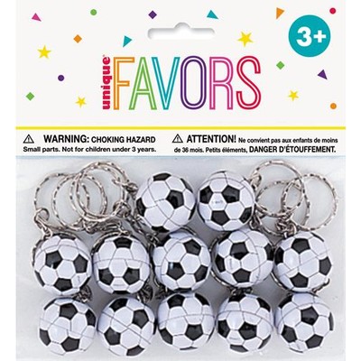 Pack of 12 soccer ball keychain party favours, each measuring approx. 2.5cm in diameter.