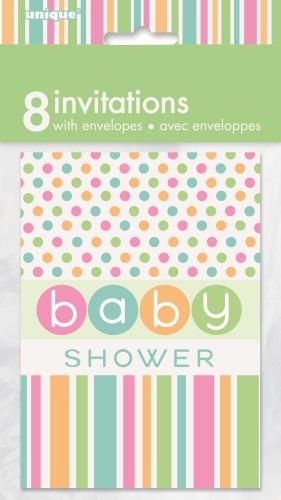Pack of 8 pastel baby shower dots & stripes invitations, each measuring approx. 10cm x 13.5cm. White envelopes included.