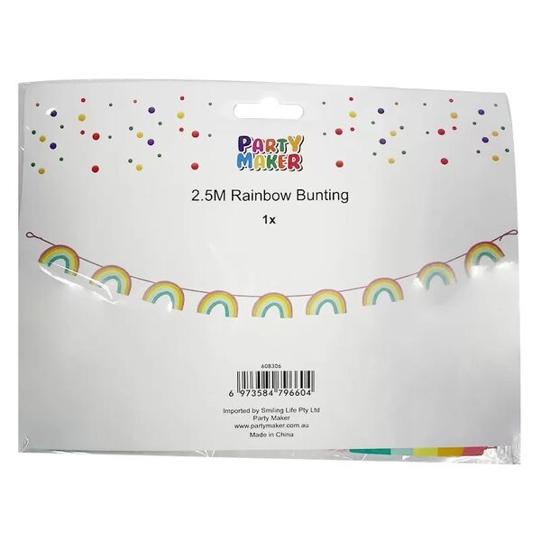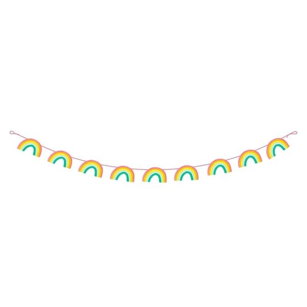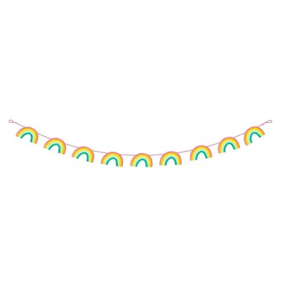 There are a total of 9 individual cardboard rainbow-shaped pennants with double-sided print, each measuring approx. 16cm (w) x 10cm (h), attached to pink twine for a total banner length of approx. 2.5 metres.