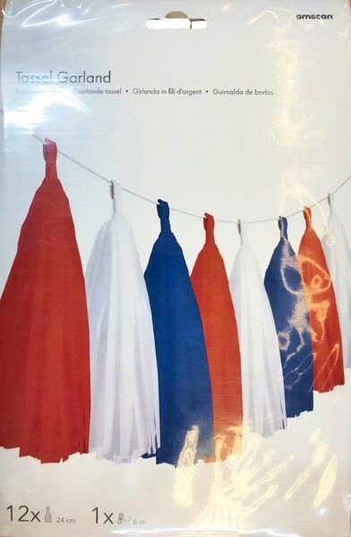 With 12 paper tassels in the classic red, white & blue, this garland is a fun & easy way to decorate your party!