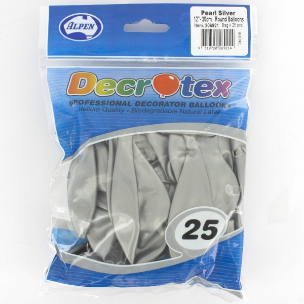 These pearl 30cm silver latex balloons are perfect for decorating a party area or putting in a balloon arrangement as a gift! With 25 balloons in a pack, these balloons are helium quality, meaning they can be filled with either helium or air. Balloons should look their best for 10-12 hours, if filled with helium, before coming down.