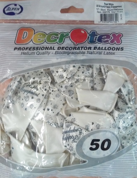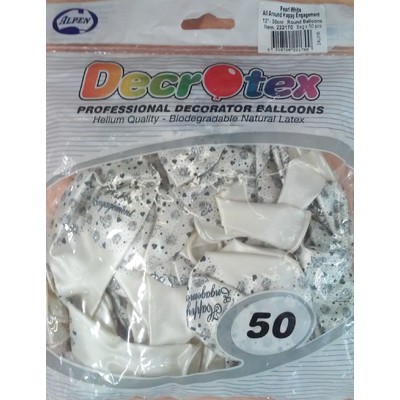 Decorate your party area with this pack of 50 round pearl white helium quality 30cm (diameter when inflated) latex balloons saying Happy Engagement! Balloons can be filled with air or helium and should look their best for about 10-12 hours before deflating slowly. Writing and decoration on balloons is in blue.