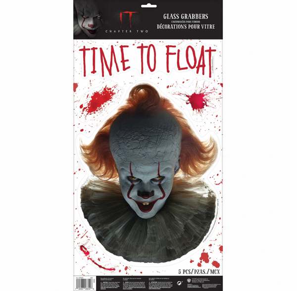 This Pennywise 'It' clown window clings are perfect for your Halloween or Friday 13th party. These glass grabbers have a clear background and can be easily applied and removed from windows and mirrors - Window clings are adhesive (but not sticky like a standard sticker). Pack includes 5 window clings in total - 1 x Pennywise 'It' face ( 29cmx 38cm) , 3 x Blood splatter (assorted size) and 1 x 'Time to Float' phrase (28cmx 7cm)