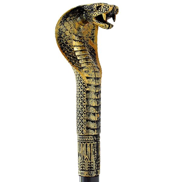 It features a black shaft and an antique gold cobra head with textured scale detailing and has a black stopper on the bottom to prevent damage.