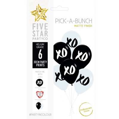 Pack of 6 pick-a-bunch balloons, perfect for tieing together to make a special balloon arrangement! Balloons are helium quality and should measure approx. 30cm in diameter when inflated. Balloons can be filled with air or helium and should look their best for about 10-12 hours before deflating slowly (if filled with helium correctly.)