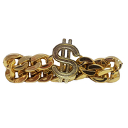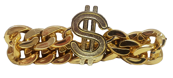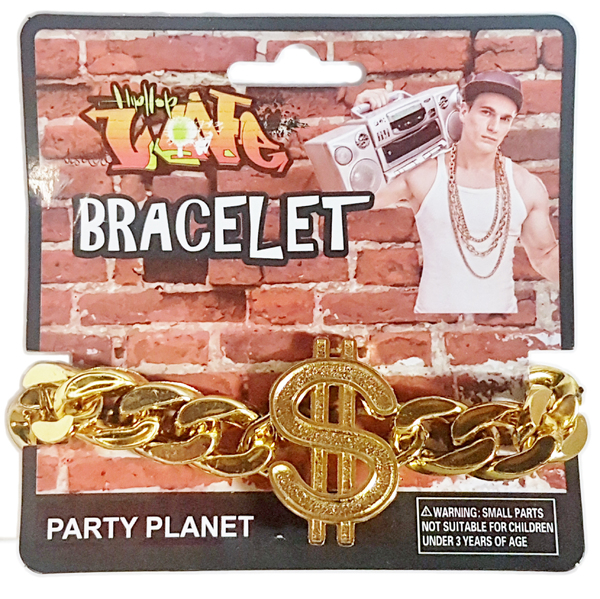 Pimp dollar sign bracelet on gold plastic chain, perfect for a 90's costume! Designed to fit most adults. Product is one bracelet only. Dollar sign measures approx. 2.5cm x 4.5cm.