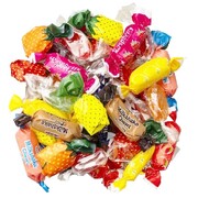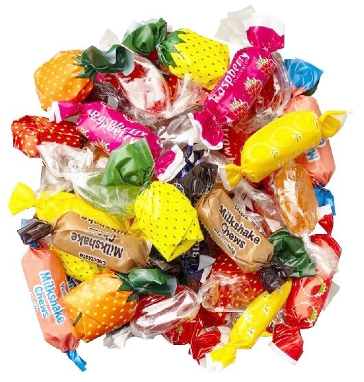 The pack contains a mix of individually wrapped lolly types - typically assorted flavour milkshake chews, fruit chews and hard fruit lollies.