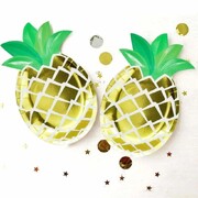These fun plates are shaped like a pineapple and feature a metallic gold & white body with green leaves at the top.