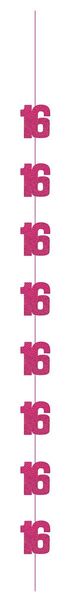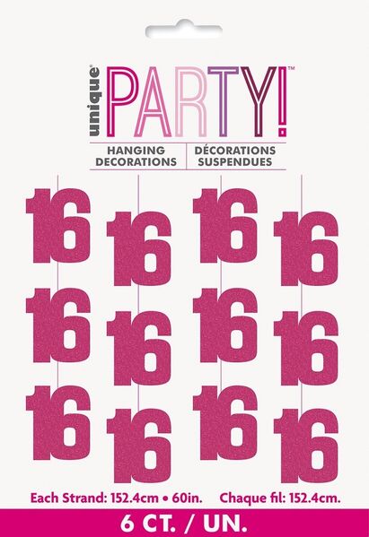 Each pack contains 6 decorations consisting of pink prismatic foil '16' cutouts on a 152cm string.