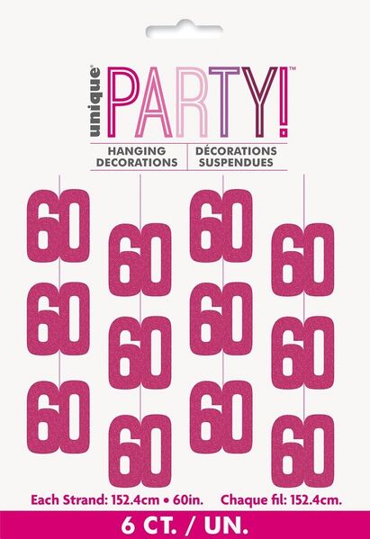 Each pack contains 6 decorations consisting of pink prismatic foil '60' cutouts on a 152cm string.