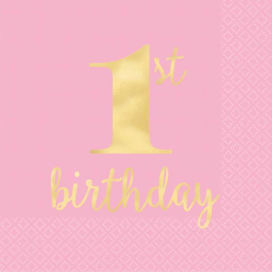 16 napkins in a pack featuring Gold Foil printing on a light pink napkin, they're easily coordinated with our other pink and gold 1st birthday supplies!!