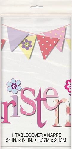 Pink Christening girl plastic tablecover, measures approx. 137cm x 213cm.