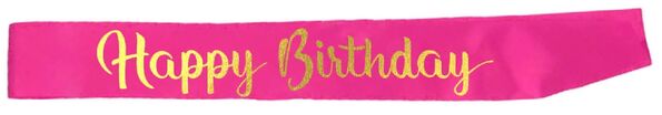 The sash is made from pink fabric printed with a stylish gold 'Happy Birthday' message on the front panel.