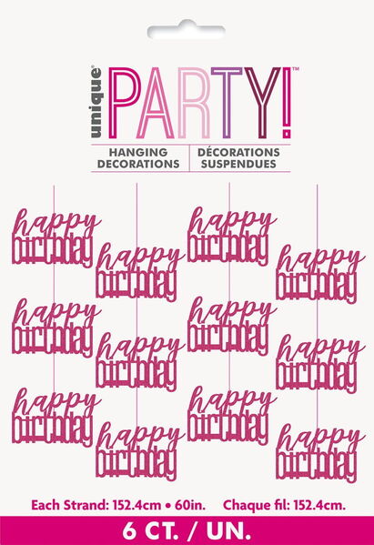 Each pack contains 6 decorations consisting of pink prismatic foil 'Happy Birthday' cutouts on a 152cm string.