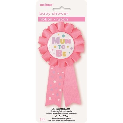 This pink Mum to be award ribbon is perfect for the mother at any baby shower! Measuring 14cm in total length, with a safety pin attached, it's easily coordinated with the rest of our baby shower supplies and sure to be a big hit!