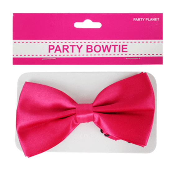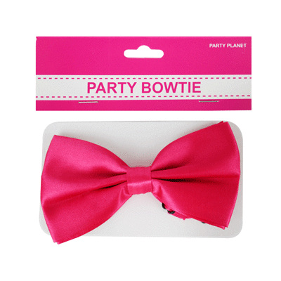 Hot pink satin bowtie, designed to fit most adults. Bowtie measures approx. 13cm x 7cm. Bowtie can be adjusted in size.