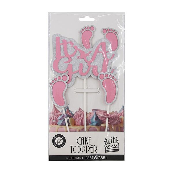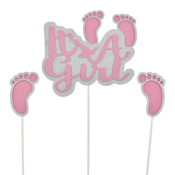 The larger topper features a silver glitter background with die-cut footprint decals and pink 'It's a Girl' wording while the 2 smaller toppers feature matching footprint designs.
