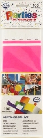 Pack of 100 pink TYVEK wristbands, perfect for heaps of different occasions! Wristbands are self adhesive and measure approx. 26cm in length x 2cm in width.