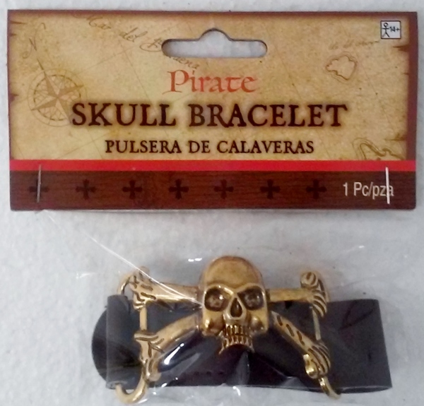 Pirate-style skull bracelet, perfect for any swashbuckling pirate costume! Designed to fit most adults. Skull on bracelet measures approx. 6cm x 3.5cm.