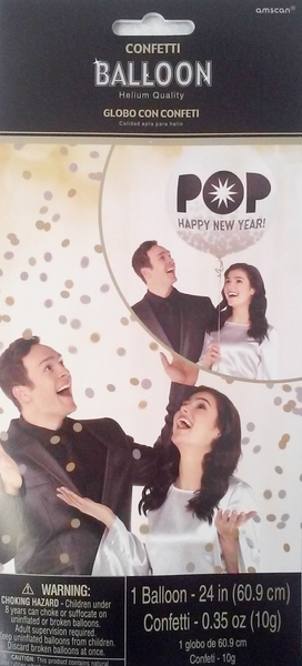 'POP HAPPY NEW YEAR!' clear latex balloon with gold & silver paper confetti inside - perfect for any NYE celebration! Balloon measures approx. 60.9cm once inflated and has 10g of confetti inside. Simply inflate with helium (balloon will look its best for 15 hours if inflated correctly with helium), tie down to a weight and pop the balloon to let the confetti fall out! Instructions included.