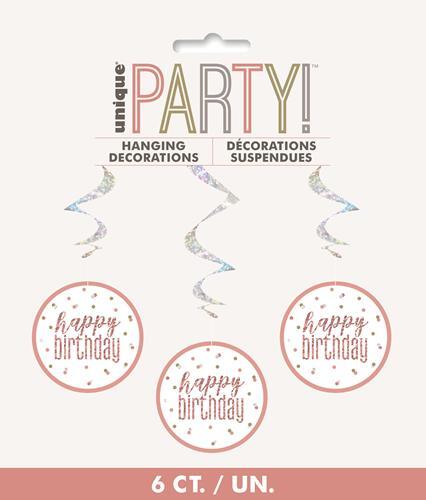 Pack of 6 hanging Happy Birthday swirl decorations - perfect for a birthday party! Swirls are prismatic silver foil and paper cutouts on bottom of each swirl (which each measure approx. 10.5cm in diameter) have a prismatic rose gold 'happy birthday' on them. Swirls measure approx. 81cm in total length. Colours/design may vary from image.