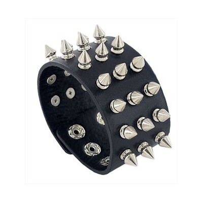 The wristband is made from durable black vinyl and features rows of silver metal spikes approx. 1cm tall.