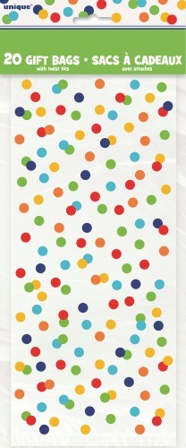 Rainbow dots cello gift bags, each measuring approx. 29cm x 13cm. 20 in a pack. Silver twist ties included.