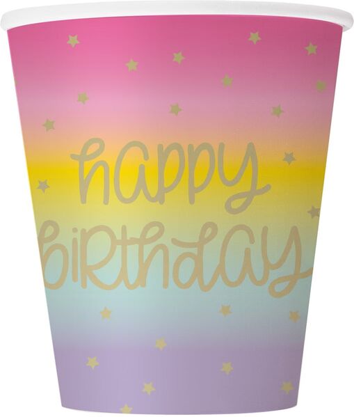 Your guests are sure to love the delightful design of these cups featuring a ombre rainbow background with metallic gold lettering and stars.