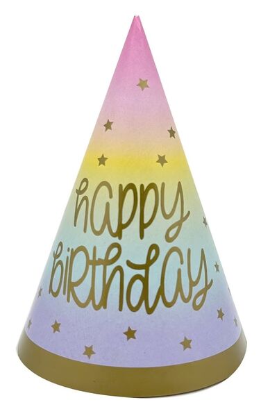Your guests are sure to love the these fun cone hats featuring a ombre rainbow background with metallic gold lettering and stars.