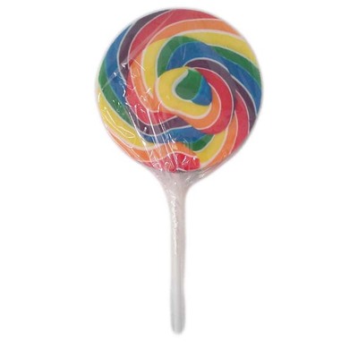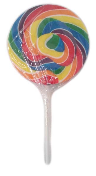 Giant rainbow swirl lollipop. Lollipop measures approx. 26cm in total height (incl. stick.) Confectionery part of lollipop measures approx. 13cm in diameter.