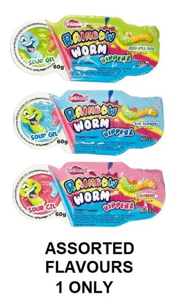 These individual serves of brightly coloured worm lollies with a tub of strawberry, blue raspberry, or green apple flavoured sour gel are sure to tantalise your tastebuds and leave your mouth tingling with delight.