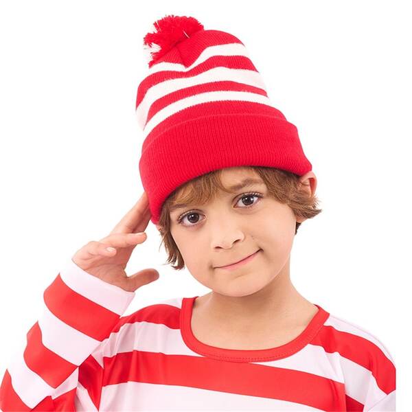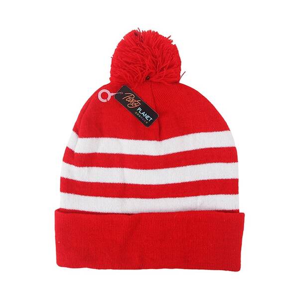 Made of synthetic stretch fabric, it features horizontal red & white stripes and a fluffy red pom pom on top.
