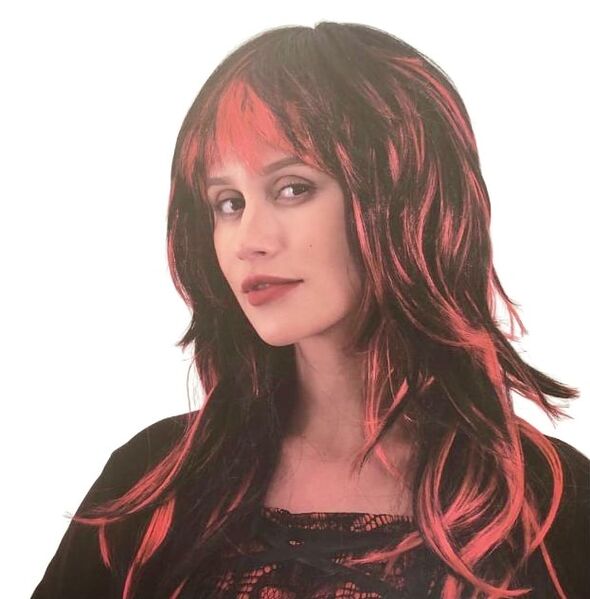 The wig is made from long synthetic black/red fibres in a choppy layered style with fringe, attached to an elastic cap that will stretch to fit most adult heads.