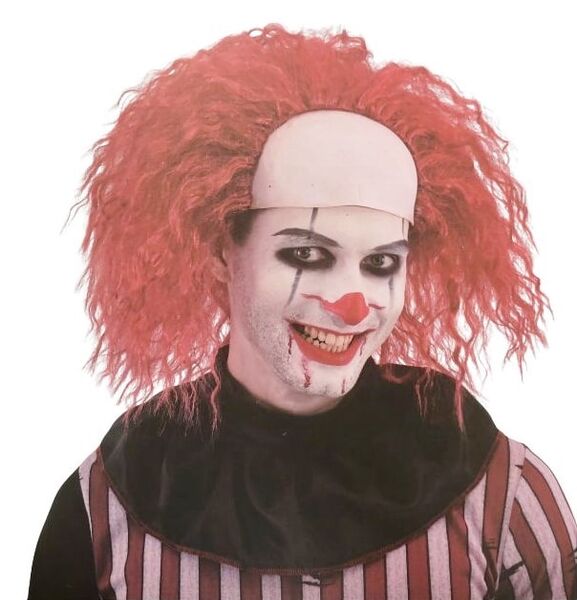 The wig is made from synthetic crimped dull red fibres, styled into a chaotic layered cut, attached to an elastic cap that will stretch to fit most adult heads. It has an attached latex forehead piece to give the effect of a receding hairline