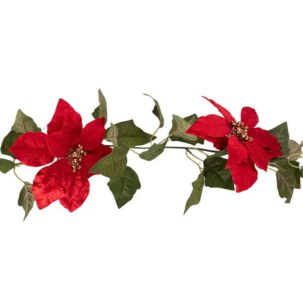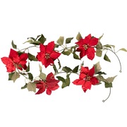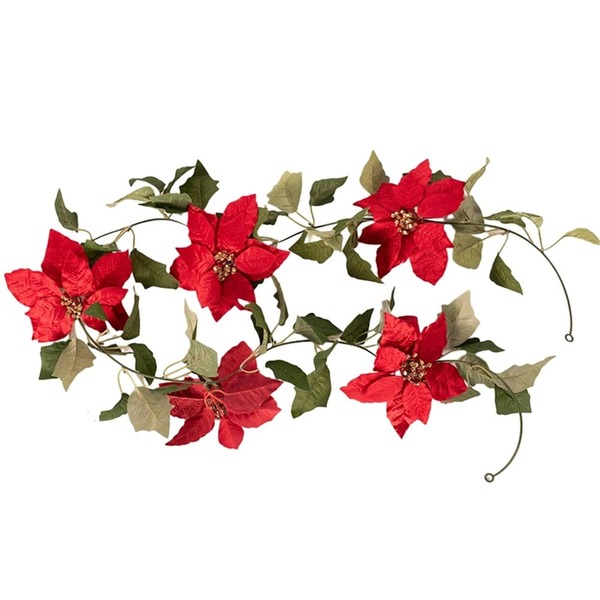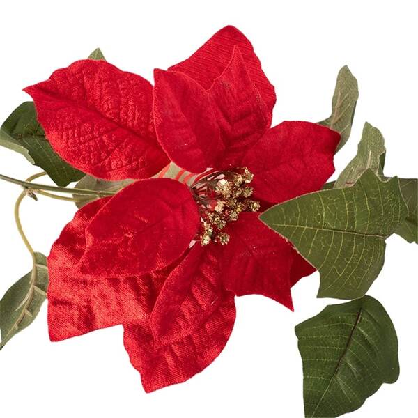 This 2m flexible plastic stem features green fabric leaves and large red velvet poinsettia with gold glitter accents along its length.