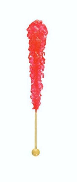 - Large coloured and flavoured sugar crystals stuck onto a wooden stick