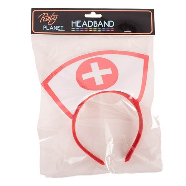 The headband is covered in red fabric and features a large white felt attachment with a red printed decal on top.