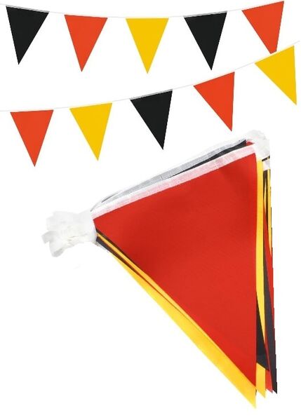 Featuring triangular red, black & yellow plastic flags, this banner will make a bright, colourful addition to your celebration.