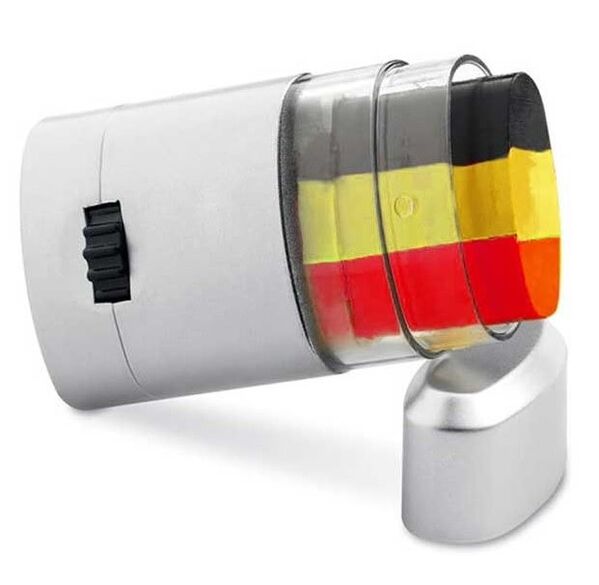 This easy swipe-on face paint applicator is like a deodorant stick - it features a solid stick of face paint in black, yellow and red stripes, in a convenient twist-up plastic container with a cap - simply twist the dial to push the paint stick up.