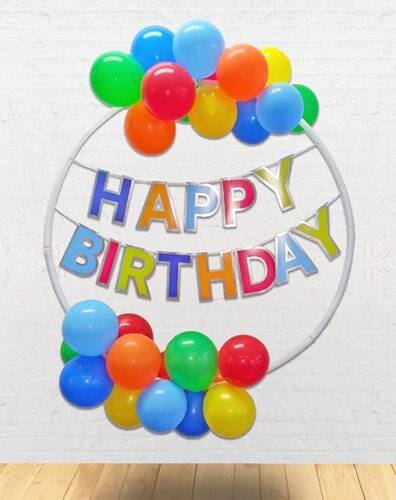 Decorate with your choice of balloons, ribbons, streamers, foliage and flowers around the hoop - add a banner or letter decorations in the centre for your own customised display piece.