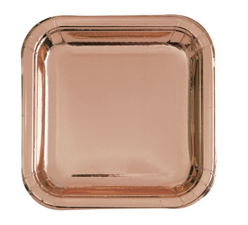 Pack of 8 rose gold square foil paper plates, each measuring approx. 23cm x 23cm.